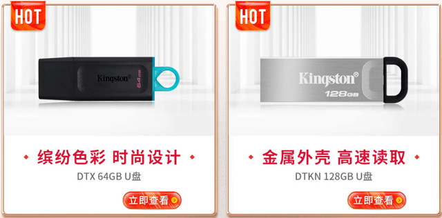 闪存盘也有多种选择,金士顿DTX闪存盘64GB和金士顿DTKN闪存盘128GB是当前热卖的两款爆品,前者拥有缤纷色彩时尚设计,后者则拥有金属外壳坚固耐用。两款均为USB3.2 Gen1闪存盘,读取速度可达200MB/s,消费者按需选择适合自己的容量即可。
