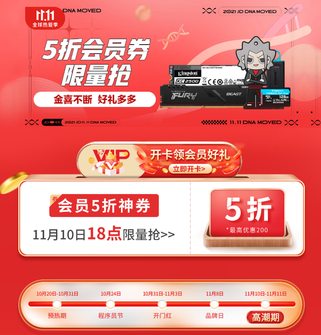 往年的京东11.11都要加班加点熬夜抢购,今年终于不用熬夜苦等了!现在加入金士顿会员,11月10日18:00准时开抢会员5折限量神券,数量有限,一定要准点来抢!