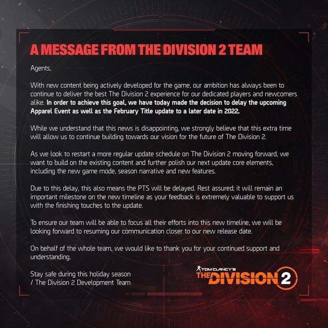 《全境封锁2》官方宣布:为了向所有玩家提供更好的游戏体验,原定于明年2月上线的《全境封锁2》大更新将调整上线时间至2022年晚些时候,但并未透露具体的上线时间。