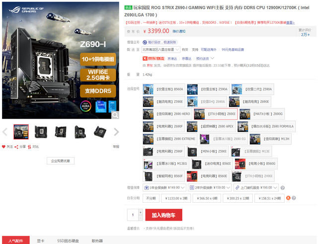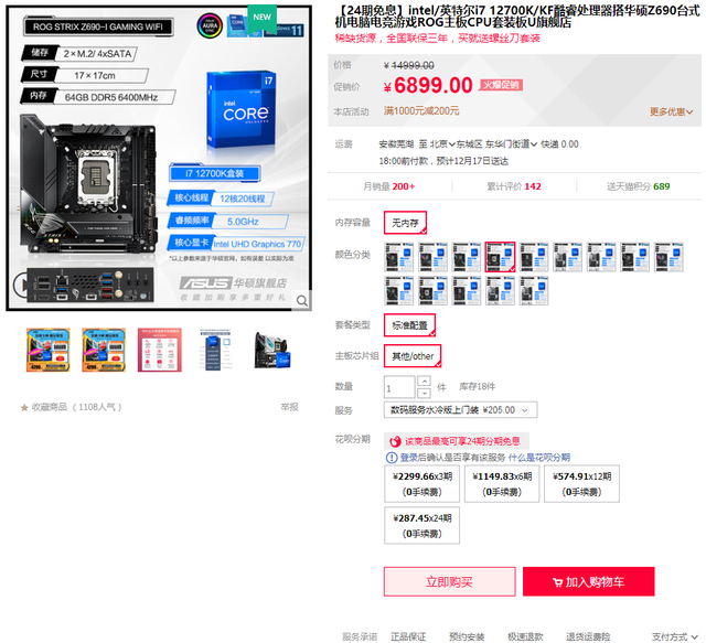 且天猫商城还有ROGSTRIX Z690-I GAMINGWIFI主板搭i7-12700K处理器套包,优惠价6899元,还可享满1000元减200元优惠及24期免息福利!