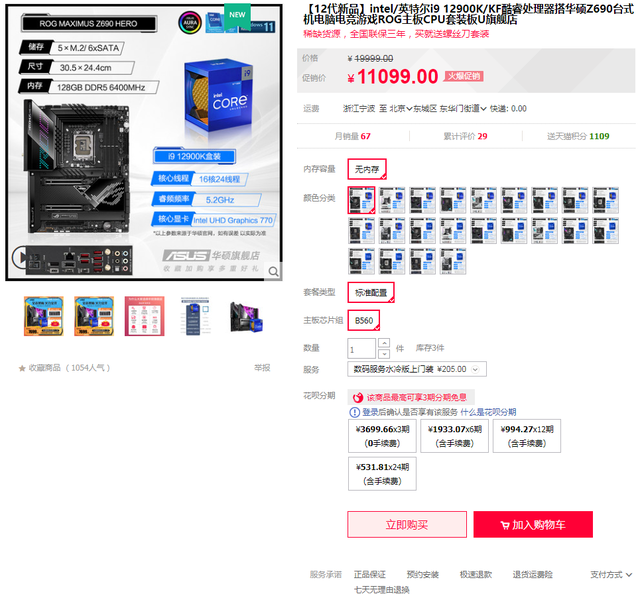 且天猫商城还有ROGMAXIMUS Z690 HERO主板搭i9-12900K处理器套包,11099元优惠中,可享3期免息福利。