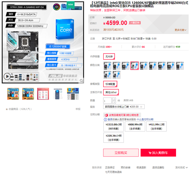 且天猫商城还有华硕Z690吹雪D4主板搭i5-12600KF处理器套包,优惠价4599元,还可享满1000元减200元优惠以及3期免息福利,入手良机不容错过!