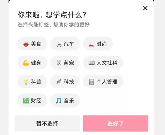 第一次进入学习频道后,系统会弹出选择兴趣标签的界面,包括食品、汽车、时尚、人文社科、科普、科技、金融等领域,如“十万个为什么”系列科普短视频、“院士说”节目、中科院2022跨年科学演讲等,方便用户更集中地获取知识内容。