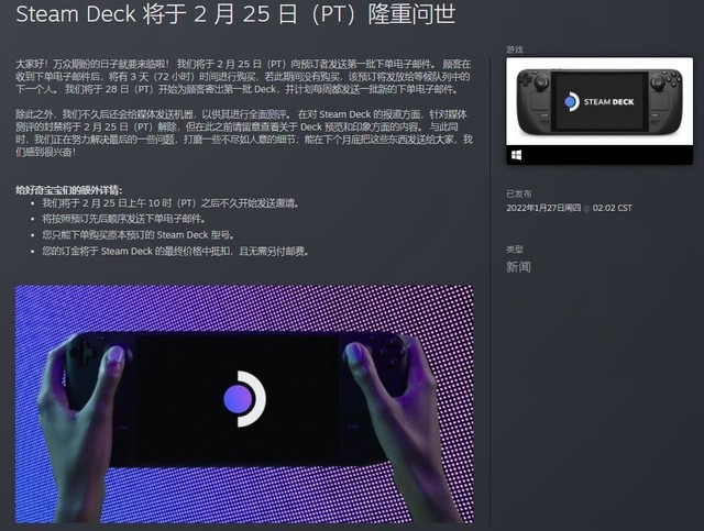 据报道,Steam Deck掌机定档2月25日发售,起售价399美元(约合2522元人民币)。
