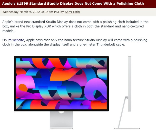 苹果最高端的Pro Display XDR,无论配置如何,都为用户提供了包装盒中的布料。购买标准Studio Display(美版起价为1599美元,国行版起售价11499元人民币)的客户将需要购买Apple的19美元抛光布或寻找其他地方以满足其显示器清洁需求。