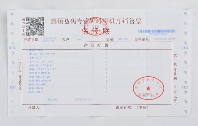 购买过后,店家发了顺丰速运,经过了几天的时间,这台主机也到了笔者手中,其中的保修单被卖家做成了类似发票的样子,要是不注意还真要被他骗了。