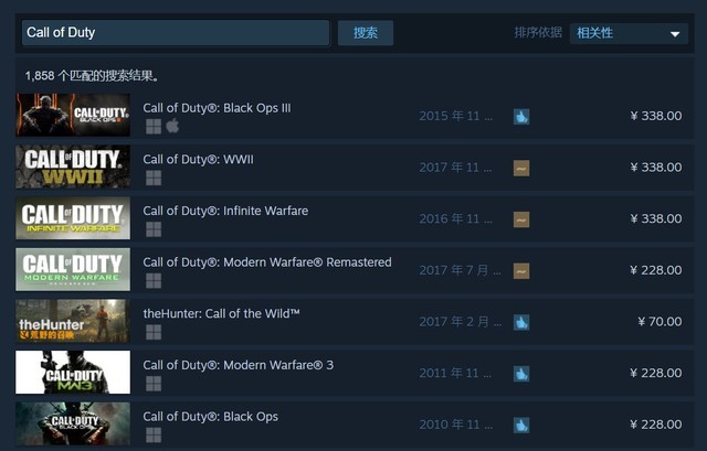 Steam上目前已解锁的《使命召唤》系列游戏有12部,包含了整个系列的大部分,上线时间都比较早,新出的几款如《现代战争2》、《现代战争3》、《黑色行动2》等还处于锁区状态,而且就当前价格来看也是让人望而却步,建议观望一波打折后再入。