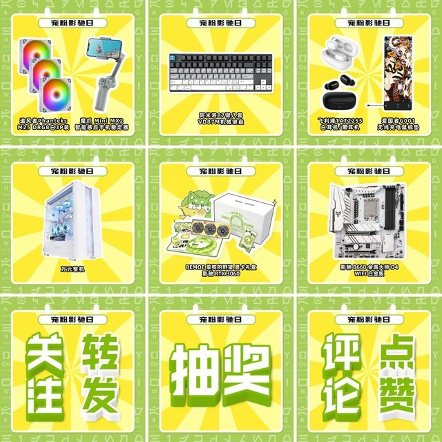 活动期间,关注影驰科技B站账号,<转发+评论+点赞>置顶动态,即可参与活动,我们将随机抽出九位幸运的小伙伴送出豪礼。