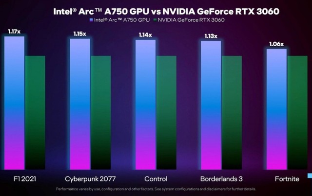 英特尔图形部门营销主管Ryan Shrout公布了A750显卡的性能测试,对比NVIDIA的RTX 3060,运行五款游戏:F1 2021、赛博朋克2077、Control、Borderlands和Fortnite,分辨率为2560x1440,高质量。在这些游戏中,A750领先最少6%,最多的是F1 2021游戏,优势高达17%。