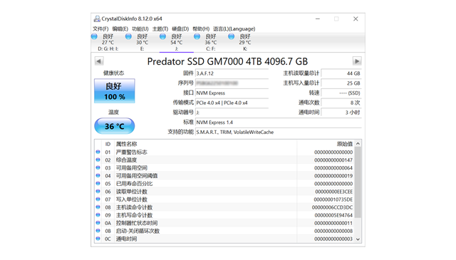 ͨ¹ýCrystalDiskInfoÈí¼þµÄ¶ÁÈ¡¿ÉÒÔ¿´µ½£¬ºê³žÂÓ¶áÕßGM7000¹Ì̬ӲÅ̵ÄÈÝÁ¿Îª4096.7GB£¨4TB£©£¬´«ÊäģʽPCIe 4.0*4£¬NVMe 1.4ÐÒ飬֧³ÖS.M.A.R.T¡¢TRIMÒÔ¼°VolatileWriteCache¹¦ÄÜ¡£