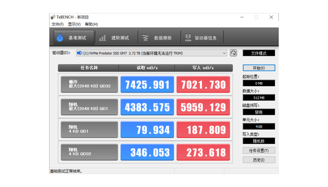 ÔÚTxBENCH²âÊÔÖУ¬ºê³žÂÓ¶áÕßGM7000¹Ì̬ӲÅ̵Ä˳Ðò¶ÁȡΪ7425MB/s£¬Ë³ÐòдÈë7021MB/s¡£ÆäÖÐдÈëÒѳ¬¹ý¹Ù·½ÖµµÄ6700MB/s£¬´ïµ½ÁË7000MB/sÒÔÉÏ¡£