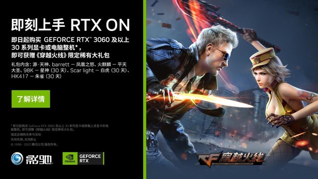 2022年12月9日00:00至2023年02月28日23:59,在指定店铺购买影驰GeForceRTX 3060 及以上的RTX30显卡或搭载影驰GeForce RTX 3060及以上RTX30系列显卡的电脑整机,确认收货,且七天内并未产生退货,即可获赠穿越火线限定稀有大礼包,数量有限,先到先得,兑完即止。