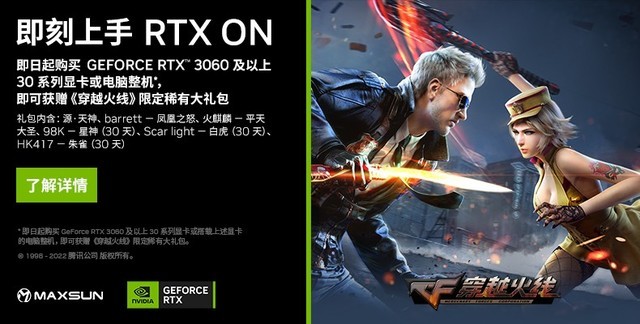 自2022年12月9日至2023年2月28日,在活动期间,在铭瑄公示的指定合作伙伴活动店铺处,购买GeForce RTX 3060 及以上30系列显卡或搭载上述显卡的电脑整机(包括GeForceRTX 3060/3060 Ti/3070/3070Ti/3080/3080 Ti/3090/3090Ti),即可获赠《穿越火线》限定稀有大礼包,数量有限,先到先得,兑完即止。
