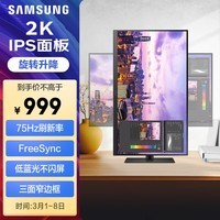 三星S27B610EQC 27英寸IPS显示器在京东活动售价仅需959元。这款显示器采用先进的IPS技术,分辨率高达2K,支持75Hz刷新率和AMD Freesync功能,让你的游戏和视频画面更加流畅。其外观设计方面,采用了三面窄边框设计,可视角度为178/178°,支持多角度调节,并且可以竖屏使用并支持壁挂。接口丰富,包括1个耳机插孔、2个HDMI接口和1个DP接口。此外,低蓝光模式和不闪屏功能可以减少蓝光辐射并提升视觉舒适度。