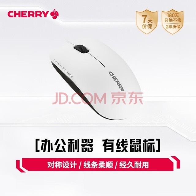 首先是我们的主打产品:Cherry樱桃 MC1000有线鼠标。此款产品的外观线条简练,以经典黑白色调呈现,十分契合现代审美元素。鼠标表面经过防滑处理,不论长期握持或迅速点击,均能确保稳定的手感。更为重要的是,它选用环保材质制造,兼顾使用者健康及环境保护需求,并且售价亲民,极具性价比,是办公室必备良品。