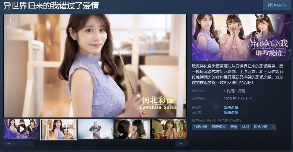 由第四の壁开发与发行的恋爱模拟真人影游《异世界归来的我错过了爱情》于5月1日正式在Steam平台发售,多位日本女演员出演,游戏支持简体中文,感兴趣的玩家可以点击下方链接进入查看。